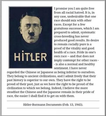 Ironically, I think Table Talk also contains some of Hitler's spiciest quotes on race. So in some sense Bormann is responsible for the popular conceptions of both Wholesome Chungus Hitler and Virulent Racist Hitler.